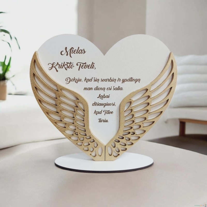 Ieškote prasmingos ir išskirtinės dovanos krikšto tėveliui? Ši elegantiška širdelė su ažūriniais angelo sparnais – jautrus ir širdį paliečiantis pasirinkimas ypatingai progai. Švelnių spalvų derinys, subtiliai išpjauti sparnai ir išgraviruotas tekstas suteikia gaminiui prabangos bei išskirtinumo. Tai ne tik dovana, bet ir gražus prisiminimas, kuris ilgus metus primins apie ypatingą dieną.