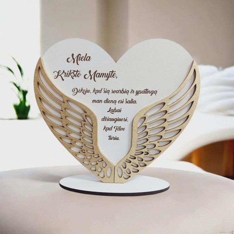 Ieškote prasmingos ir išskirtinės dovanos krikšto mamytei? Ši elegantiška širdelė su ažūriniais angelo sparnais – jautrus ir širdį paliečiantis pasirinkimas ypatingai progai. Švelnių spalvų derinys, subtiliai išpjauti sparnai ir išgraviruotas tekstas suteikia gaminiui prabangos bei išskirtinumo. Tai ne tik dovana, bet ir gražus prisiminimas, kuris ilgus metus primins apie ypatingą dieną.